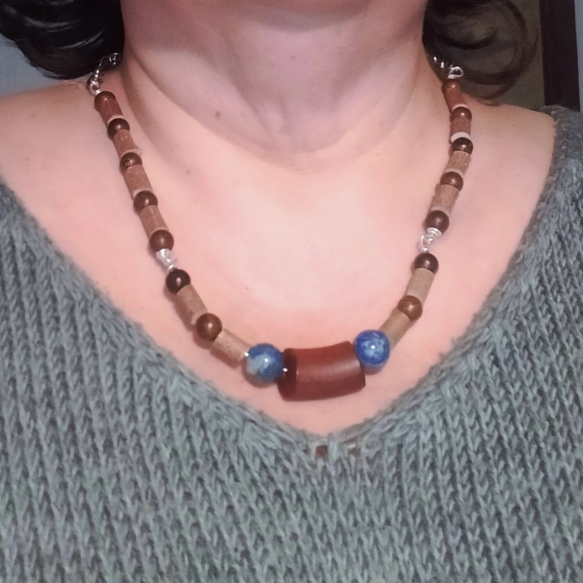 Collier mixte bois de noisetier et pierres sodalites
