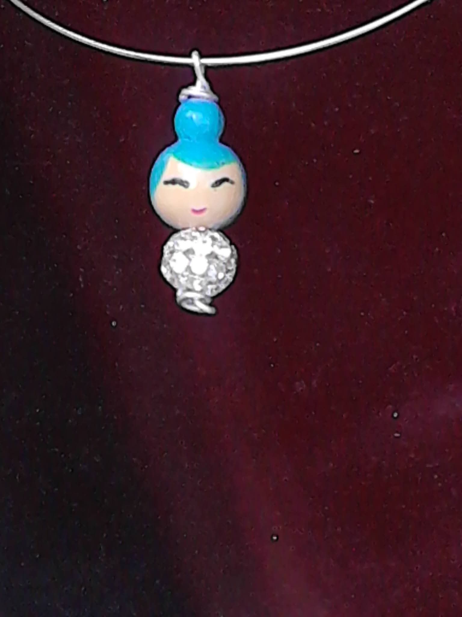 Collier pendentif poupée en perle en bois bois peinte à la main et perle strass monté sur torque en acier inoxydable. 48 cm, poupée 4 cm.